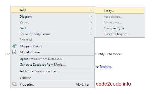 Từ màng hình Surface của Visual studio chúng ta chọn Entity từ toolbox hoặc nhấp chuột phải chọn Add → Entity...