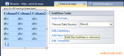 Sau đó tạo 1 page UserList.aspx, và kéo control GridView vào page từ toolbox và đặt tên là grdviewUsers.