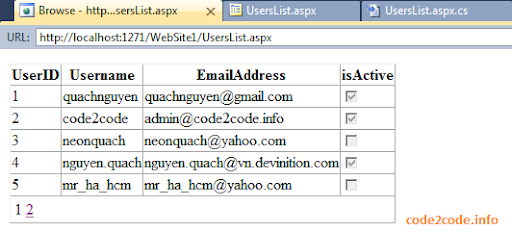 Ok giờ nếu chúng ta nhấn vào page số 2 chúng ta sẽ gặp lổi: The GridView 'grdviewUsers' fired event PageIndexChanging which wasn't handled. Lổi này do chúng ta chưa xữ lý sự kiện paging cho gridview user.