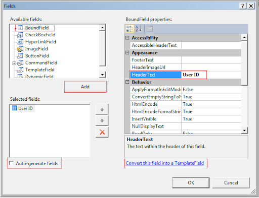 Column UserID: từ BoundField → Add → Set Header: User ID → Set Data Field: userid → Convert this field into template field. Uncheck Auto Generate field