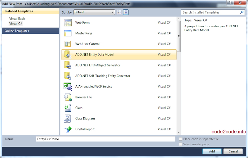 Nhấp chuột phải vào website chọn Add New Item...Sau đó chọn ADO.NET Entity Data Model, chọn connect tới csdl có chứa table Users, mọi việc phải được hoàn tất cho đến khi Entity Users hiển thị trên visual studio's surface.