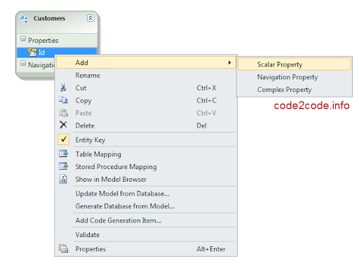 Sau đó Entity Customer available ở surface của visual studio, để thêm các thuộc tính khác mình nhấp chuột phải vào entity customers → Add → Scalar Property