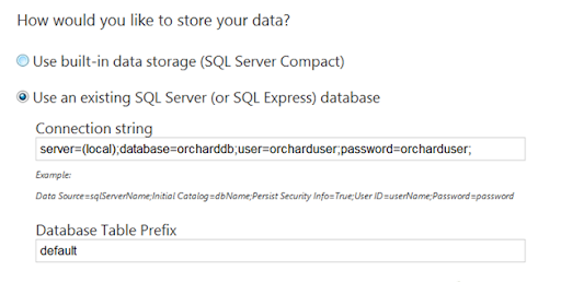 Mình sẽ chọn Option Use an existing sql server (or sql express) database. (Mình đã tạo db tên là orcharddb và user login trước đó)